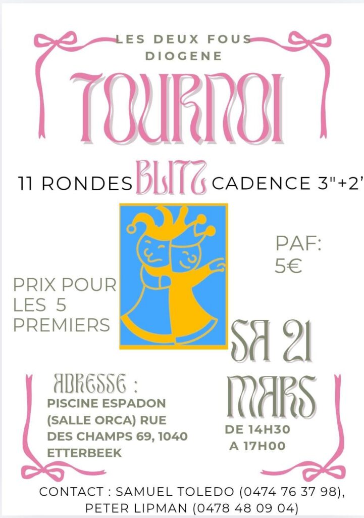 Auteur Les Deux Fous du DiogènePublié le mars 17, 2026mars 17, 2026Catégories blitz, échecs, Nos annonces, Nos tournoisÉtiquettes blitz, échecs, tournoi